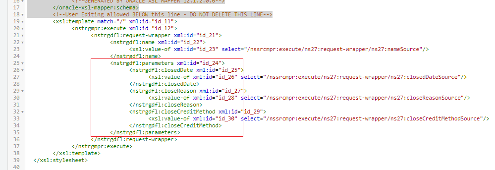 This is not a normal JSON object because each element in the array “parameters” has a different schema. Relying on the mapping design tool solely will produce an unexpected JSON object. A solution to this problem is that we manually modify the transformation in XSL code to achieve the desired outcome. Let’s use the close subscription REST call as an example to demonstrate how we can make the mapping work with some additional manual steps.