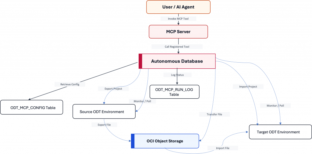 This article presents an approach that puts the MCP server at the center of the solution. Using Oracle Autonomous Database as the execution layer and PL/SQL packages as the orchestration engine, Oracle Data Transforms project deployments can be exposed as MCP tools and invoked remotely through a consistent interface. This makes the deployment workflow easier to automate, easier to monitor, and easier to integrate with AI-driven or external operational workflows.