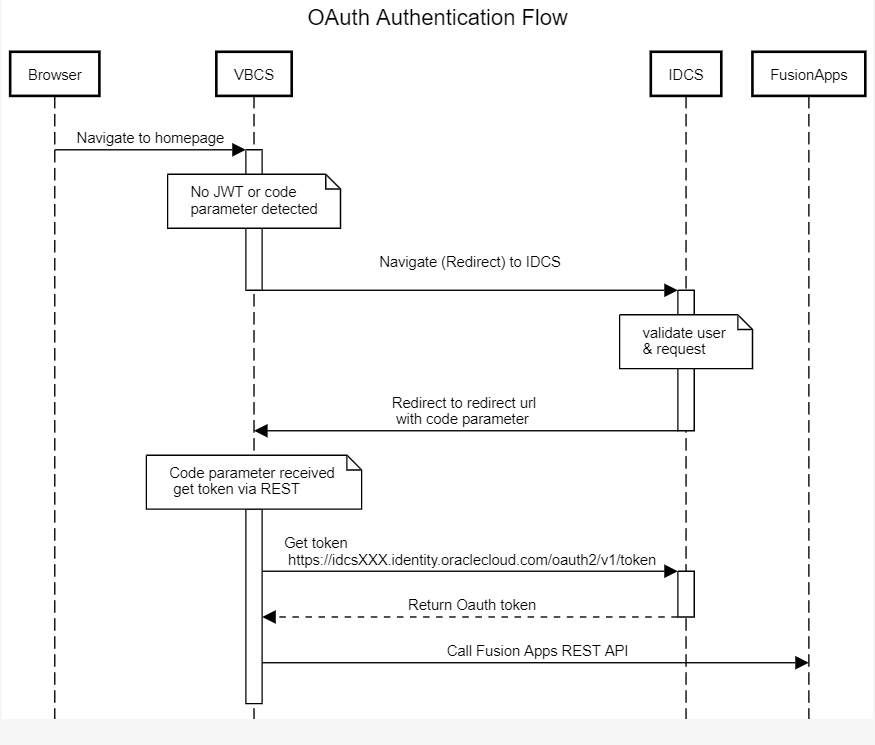 The VBCS application receives the redirect, it detects the “code” parameter and thus knows it has been called as part of the redirect flow from IDCS