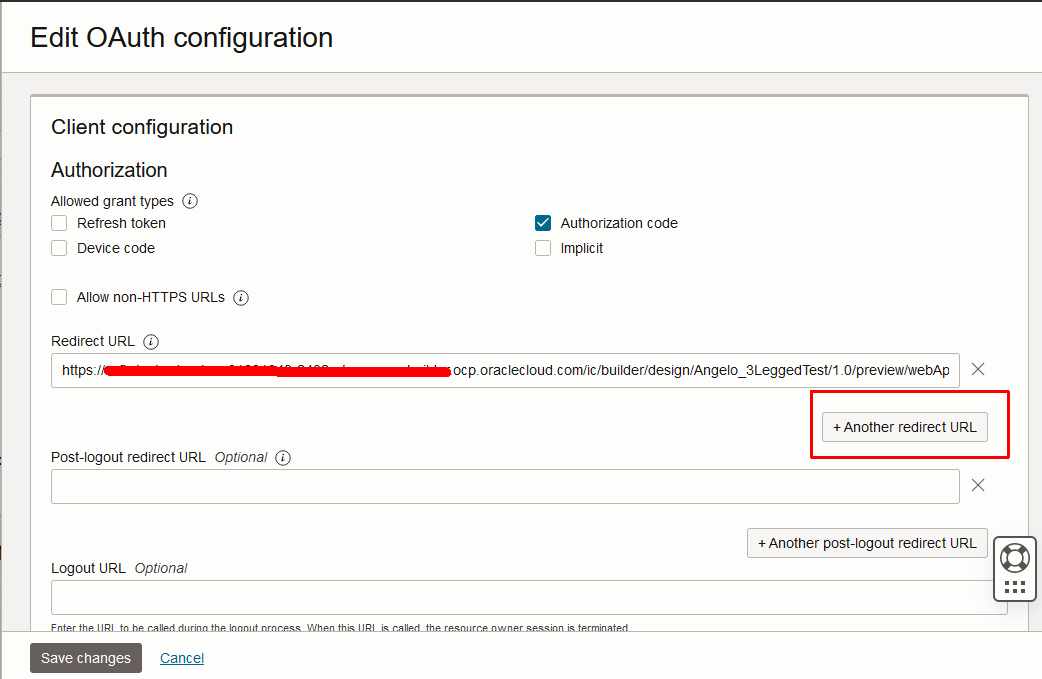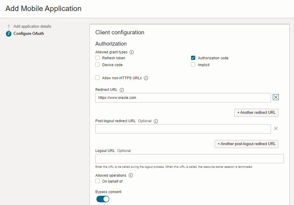 For now, in the redirect URL enter any URL, e.g. https://www.oracle.com. We will need to change this later.
