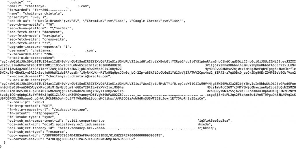 Now, if you call https://api.example.com/echo, you’ll get a JSON response showing all the headers the OCI Function received. This includes headers added by the Gateway, such as claims from the JWT.