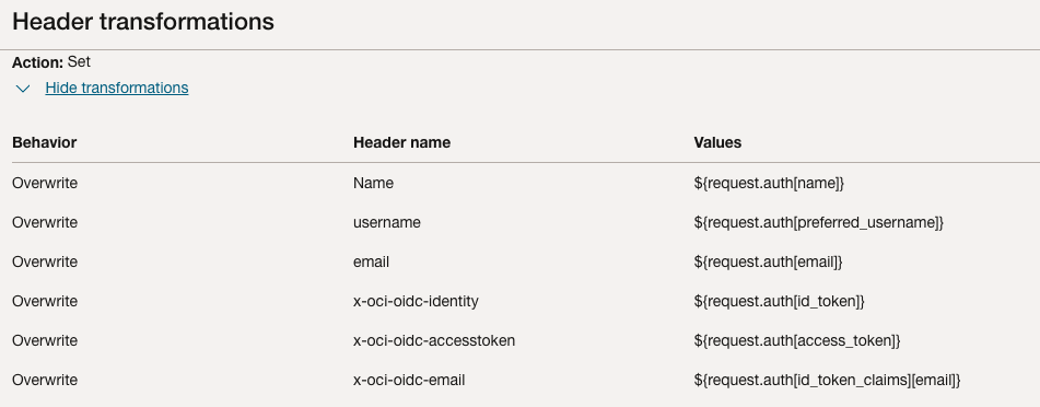 While designing transformations, it can be useful to verify exactly what headers the API Gateway is forwarding.A simple way to do this is to temporarily configure a lightweight backend (for example, an OCI Function) that returns all the headers it receives.