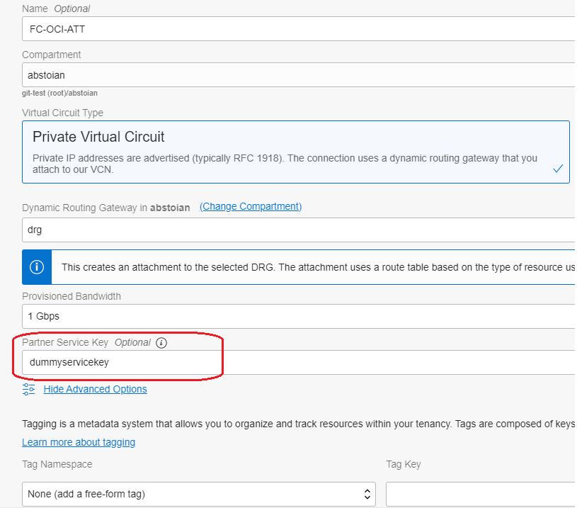 After this step you will obtain the Service Key (follow the steps from 1 to 8 from the previous mentioned blog) and update the Virtual Circuit on OCI with the correct Service Key.