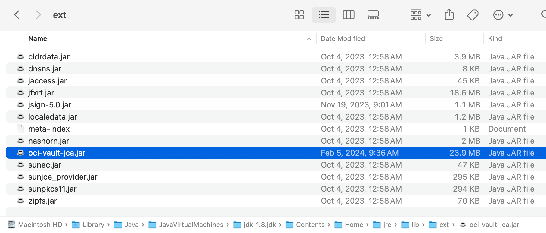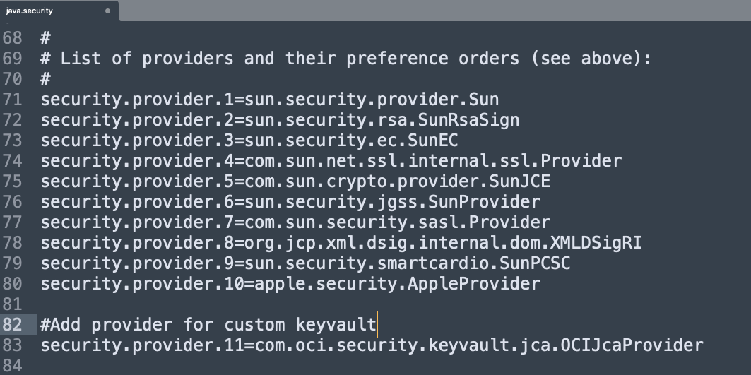- Modify java.security file from $JAVA_HOME}/jre/lib/security in your Java environment to include the OCI JCA provider.