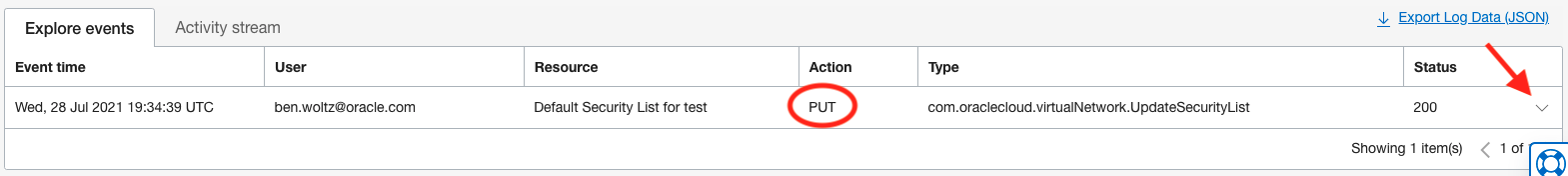 - To see more details about this change, let’s click on the down arrow to the far right to expand the details of this log entry. You may notice the output is in JSON format and contains a lot of detailed information, including the compartment name and ID, resource ID, etc.