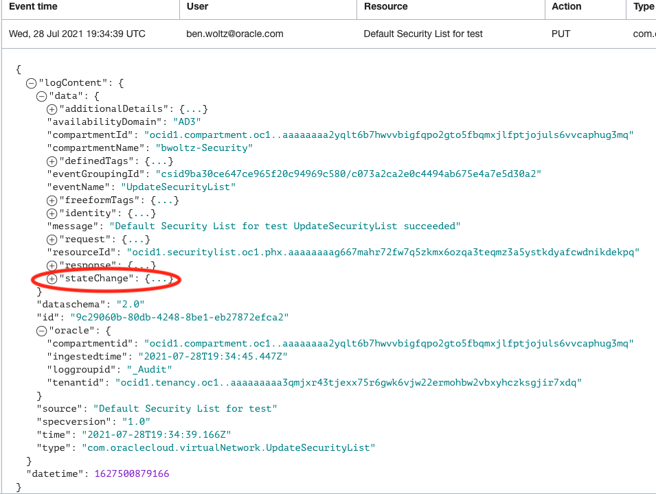 - To look at the details of what was changed, click on the + next to “stateChange”. Under “stateChange” you will notice a section for “current” and “previous”. Under “current” it will show us details about this security list currently, after the change. Under “previous” it will show us details about this security list prior to this change. By investigating and comparing the differences between these, we’ll be able to tell exactly what was changed.