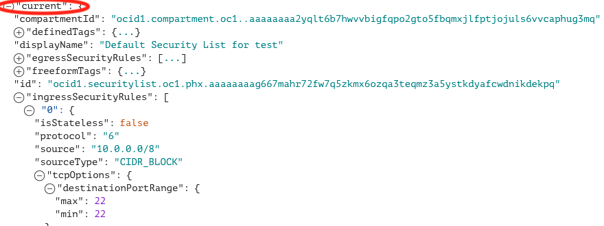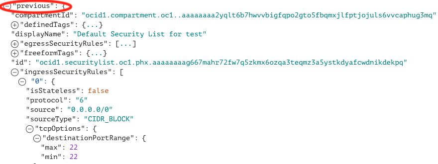 - Under “ingressSecurityRules” >> “0” for the “previous” state, which corresponds to the first security rule in the list, we see that it has “0.0.0.0/0” for the source and “tcpOptions” shows port 22 which is the SSH rule allowing our traffic for the bastion host. This means that TCP port 22 (SSH) traffic was allowed from all source IPs before this change.