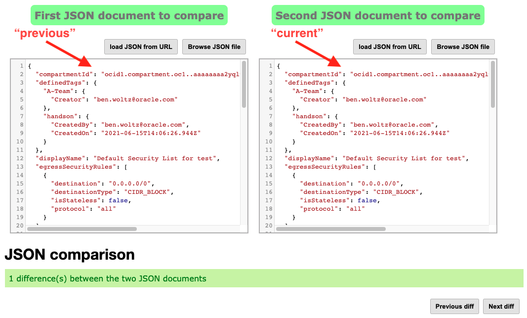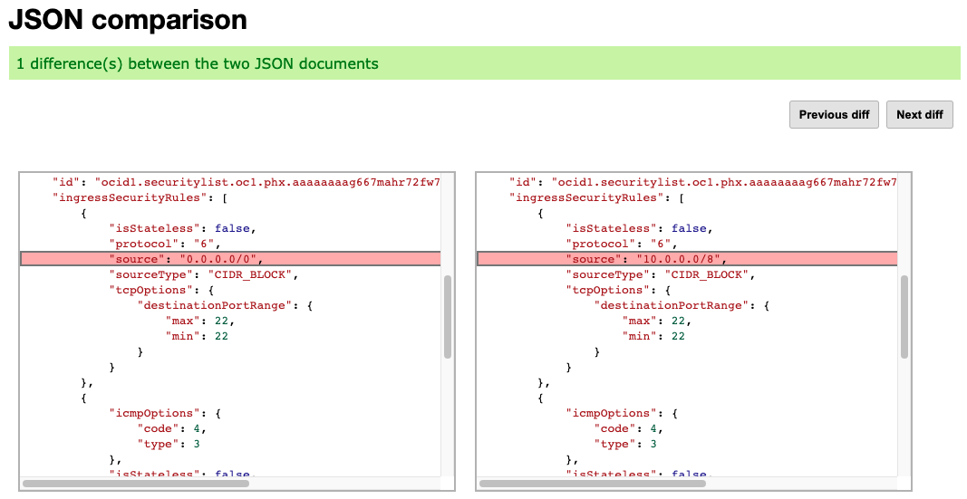 In the previous example, it was very simple to identify what was changed as it was in the very first security list rule that we checked (labeled “0”). However, there may be scenarios where the amount of data in the audit log entry to check is very large and it will take a long time to manually click through each item to visually see what changed. For example, if our security list had 100 rules and the rule that was changed was the last one, you would have to click on all 100 rules, both the current and previous, before you see the one that changed. For this scenario, you can use a JSON Diff tool that will show you very quickly what has changed between two JSON outputs. JSON Diff tools are typically available online and for free, for the below example I am using one from extendsclass.com but you can use another one if you prefer. We will copy the “current” section from our audit log, and paste it into the JSON Diff tool, and then copy the “previous” section from our audit log, and paste it into the JSON Diff tool and it will show us exactly which part of the JSON output is different between the two.