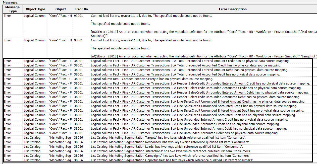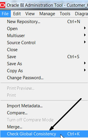Click File -> Check Global Consistency to run a Global Consistency check on TempOutputRPDFile / TempOutput_OracleBIApps.rpd to locate the errors listed in the logs (see screenshot below).