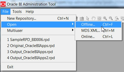 Once the BI Administration Tool has been installed and configured, launch the tool from the start menu. Click Open -> Offline to open the RPD file in offline mode (see screenshot below). It may be helpful to have multiple RPD files open at once. To do this launch the BI Administration Tool for each RPD you need to open.