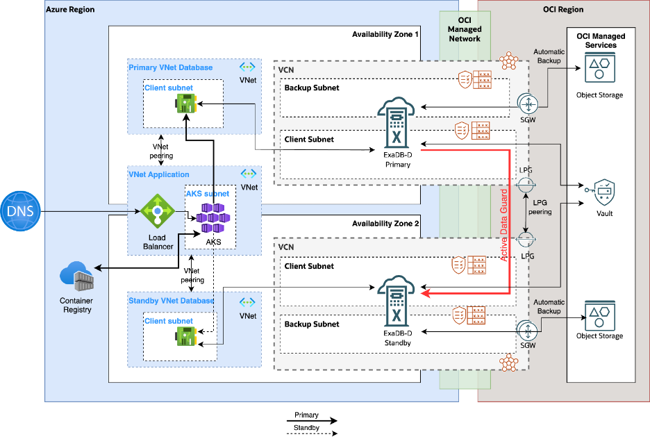 This topology supports a single-region, cross-Availability Zone (AZ) disaster recovery architecture for Oracle Database@Azure by using the Oracle backbone for database synchronization and failover readiness. In this design, the primary and secondary Oracle Database@Azure databases are deployed in separate AZs to provide high availability and fault isolation within the same region. The application tier resides in a dedicated VNet, which is directly peered with both the primary and secondary Oracle Database@Azure VNets to enable database connectivity. Oracle Data Guard or Active Data Guard is used to replicate data between the primary and standby databases, ensuring synchronization and supporting high availability.