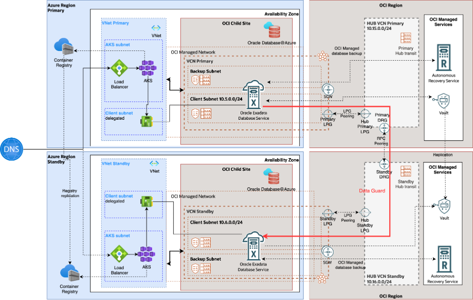 - The Oracle Database@Azure VNet is connected to the hub VNet through direct VNet peering.