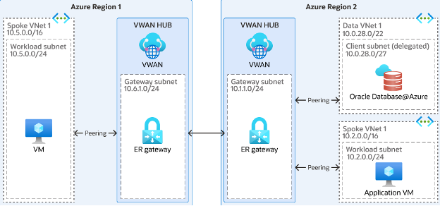 - Each VNet, including the Oracle Database@Azure VNet, is attached to the corresponding regional Azure Virtual WAN (vWAN) hub.