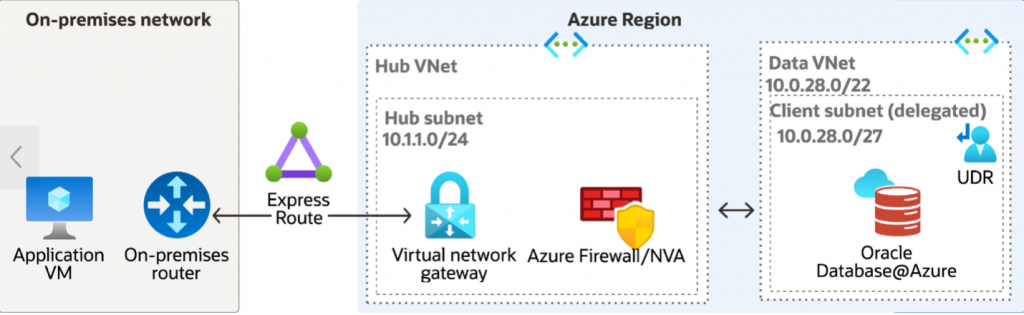 - When a network virtual appliance (NVA) is deployed, a user-defined route (UDR) must be configured in the Oracle Database@Azure VNet to direct traffic destined for on-premises CIDR ranges to the NVA’s private IP address.
