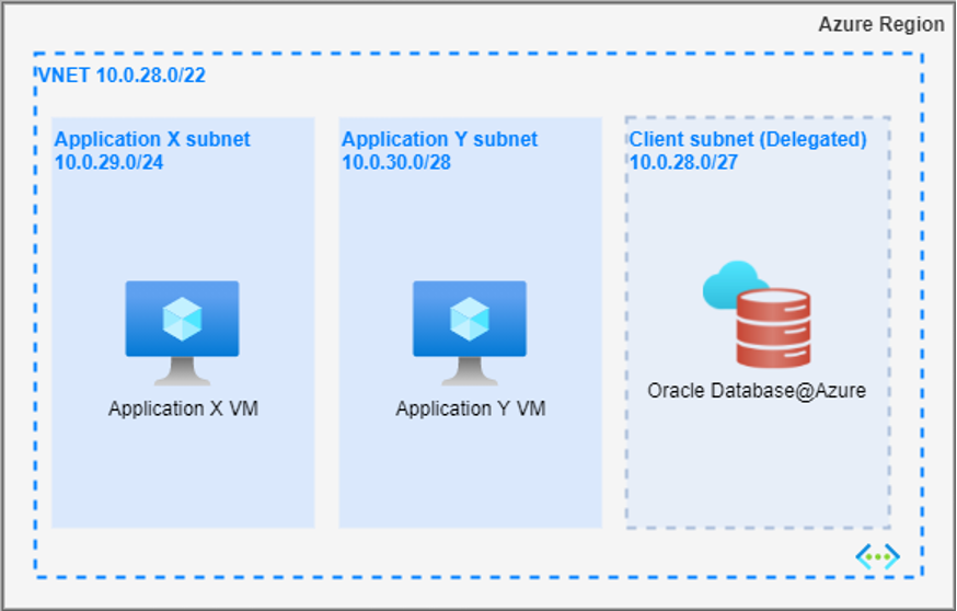 This is the simplest and most basic networking topology. In this model, the application subnets and the delegated subnet for Oracle Database@Azure reside within the same virtual network (VNet). Depending on organizational requirements, these subnets can be placed within the same availability zone (AZ) or distributed across different AZs.