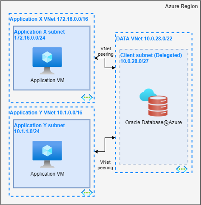 In this topology, Oracle Database@Azure is deployed within a dedicated VNet, while applications are hosted in separate VNets. Connectivity between the application VNets and the database VNet is established through direct VNet peering. Depending on organizational requirements, there can be one or multiple VNet peerings.