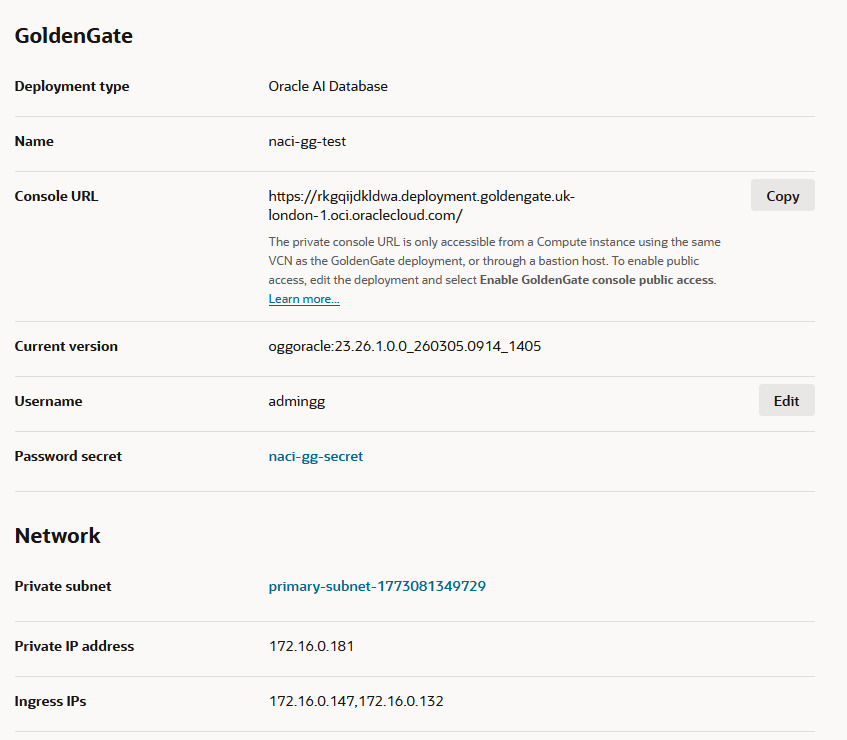 In the Deployment menu there is an optional “Enable GoldenGate console public access” button. If you enable it, the following will happen: