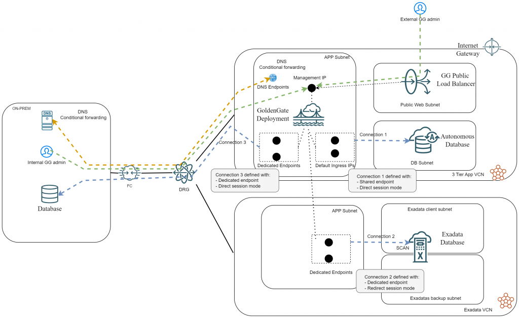 • Connection 3 is to an Oracle Database deployed on-prem and is using Dedicated Endpoints in VCN1.