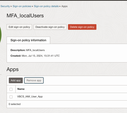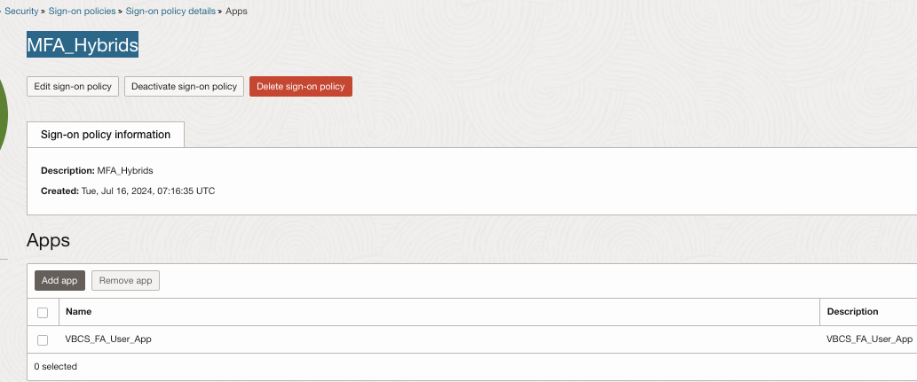 3. We can also enable Sign-on Policy at VBCS Instance level, in that case you would not have flexibility of different Sign-on Policy at Application level, however if you enable at VBCS Instance level (by adding VBCS instance in App), you can skip – step 7 to create confidential app, post adding at Instance level, all VBCS applications would follow this Sign-on Policy – MFA_Hybrids.