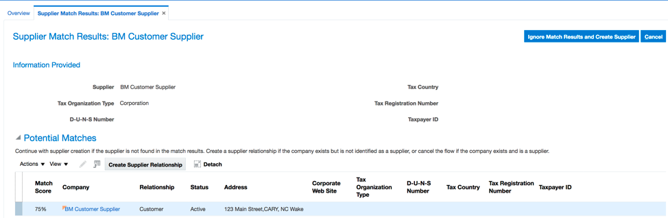 Supplier relationship can be established to an existing “Account” record using “Create Supplier Relationship” button on the screen instead of creating a duplicate record. Additional Supplier Profile data can be added that are related to Procurement Cloud transactions.