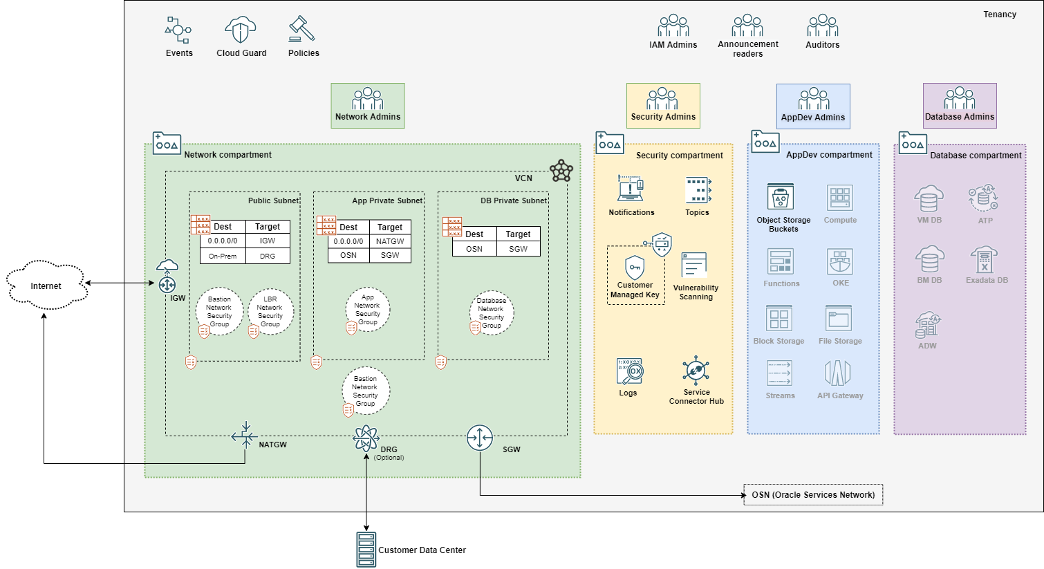 - Segregation of duties, implemented through IAM policies coupled with groups and compartments design;