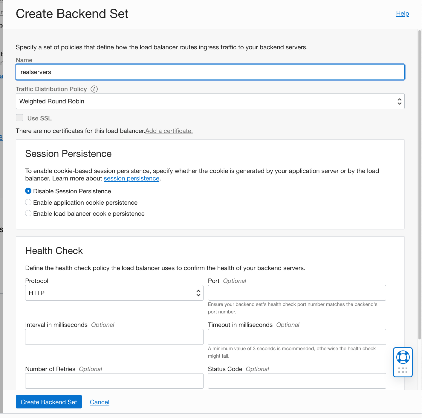 Once your Load Balancer has been created (which should take just a moment) click on the Backend Set navigation option and then click the Create button. We need a backend set to reach our actual web servers so give it a good name (e.g. “realservers”) and make any other selections for load balancing, health checks, etc. that you need. At a minimum that means you need to enter a Health Check URL but other options might be needed in your environment.