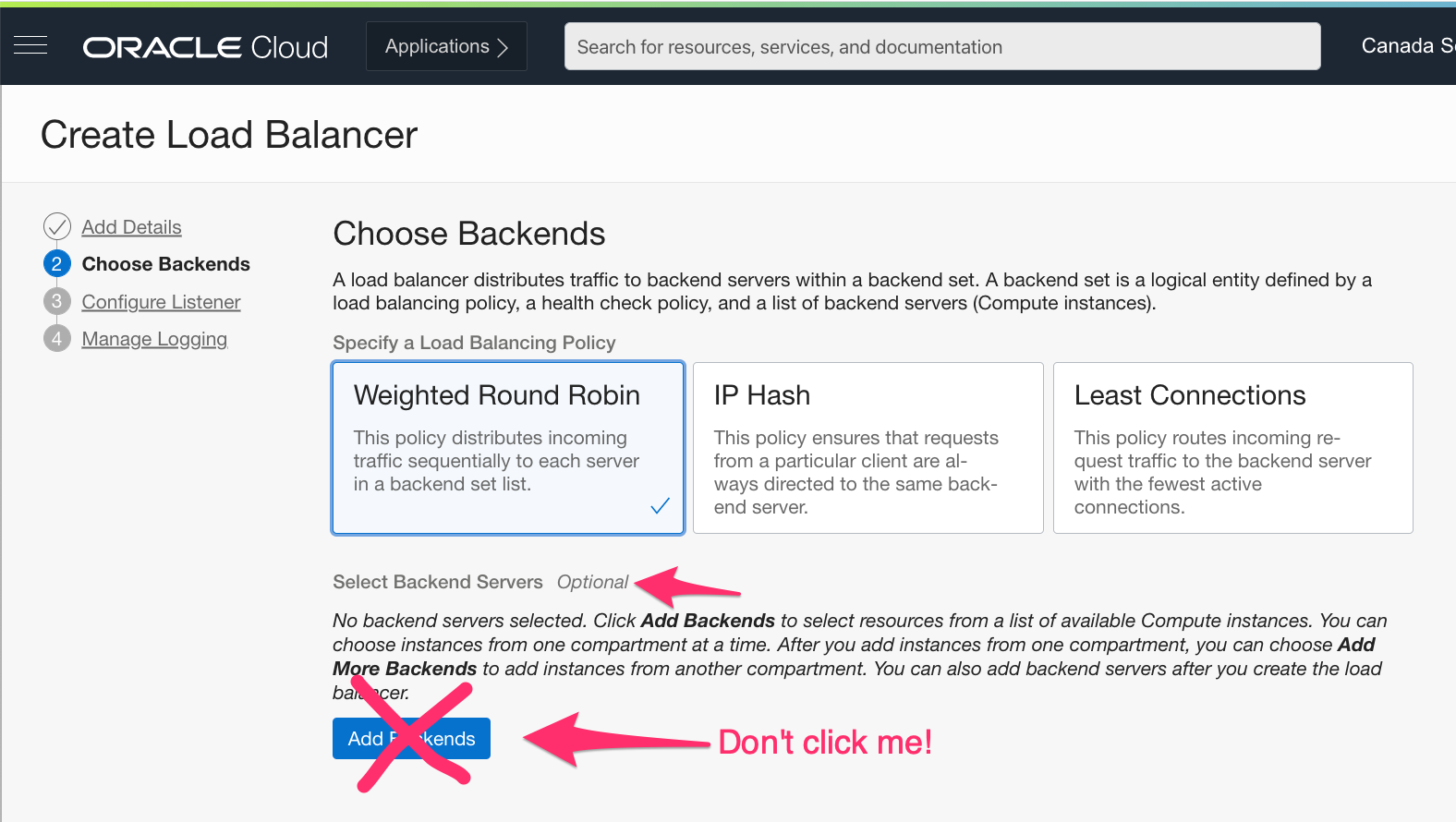 When you do this OCI will automatically create a backend set for you with no servers. This is exactly what we want – we’re going to ignore this backend set altogether!