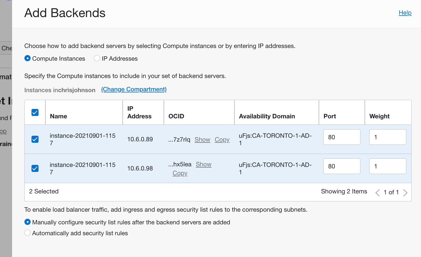 Finally, open that new Backend Set and select the web servers you want to use from the GUI, or enter their IP addresses. In my case I already have Security Lists open so I opted to ignore that setting.