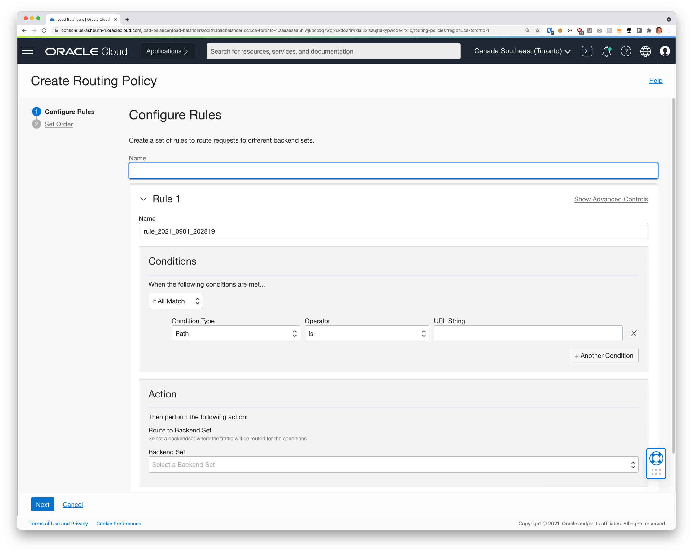 There is a bit of power hidden on this screen, but all we need to do is enter a name, pick “Starts With” as the Operator, and enter “/myapp/” in the URL String box. And then finally choose “realservers” from the Backend Set selection box.
