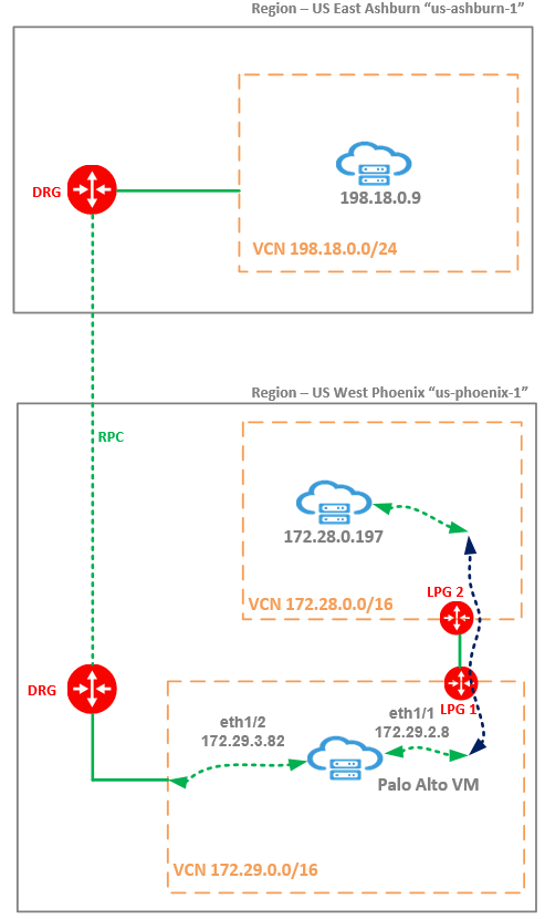 Traffic path from Ashburn to Phoenix: 198.18.0.9 -> Ashburn DRG -> RPC -> Phoenix DRG -> PA eth1/2 -> PA eth1/1 -> LPG 1 -> LPG 2 -> 172.28.0.197.