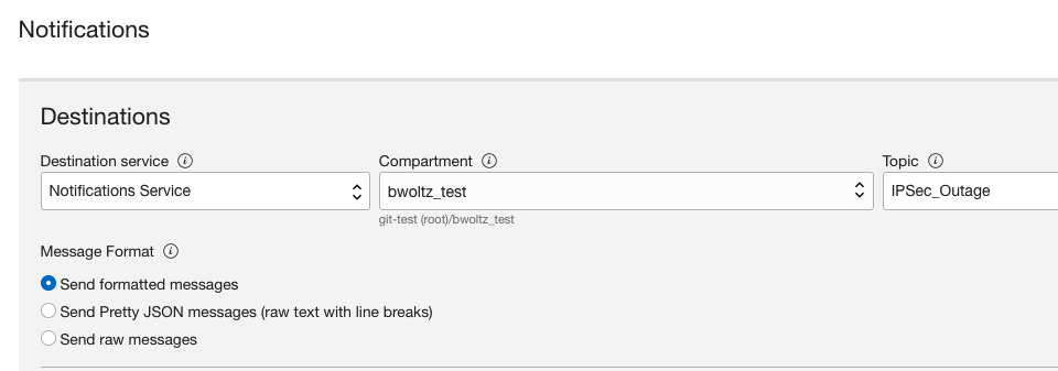 • Under the Notification section, select ‘Notification Service’ as the Destination Service, select the compartment you created the above Topic in (IPSec_Outage), and select the Topic you created from above (IPSec_Outage)