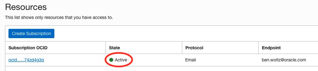 • After the Subscription is created, a confirmation email will be sent to the email address we provided and we will need to click on the link in that email to confirm the subscription.  When you confirm the subscription, the subscription state in the console will change from yellow Pending state to green Active state.
