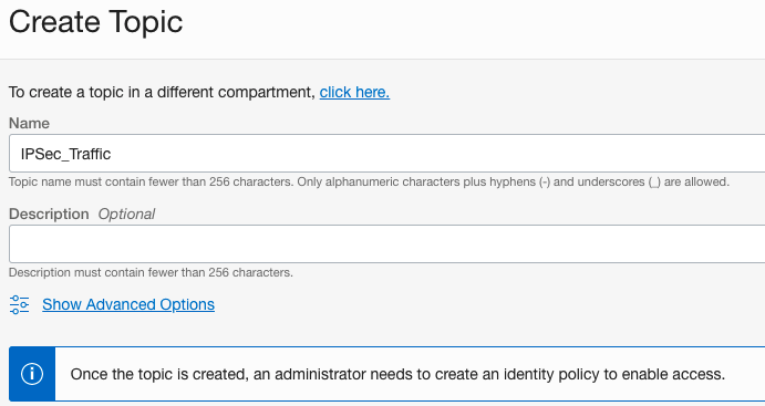In this kind of design, during normal operation the traffic on the backup path is very low as it is sitting idle waiting for a failure on the primary path before it takes on any traffic.  This creates an opportunity for us to create an Alarm on the backup path and trigger when we see traffic increase which would notifiy you that you may have an issue on the primary FastConnect.  For this example we will be creating an Alarm on an IPSec Tunnel that is backing up a FastConnect Virtual Circuit.  We will first create a Notification Topic and Subscription and then we will create an Alarm that will trigger when OCI detects an increase in traffic on the backup IPSec Tunnel Bytes Sent Metric.