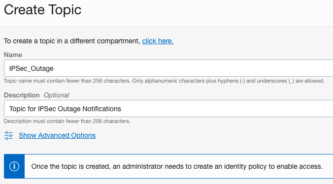 In this scenario we are going to create a notification that will send us an email when OCI detects a state change with a FastConnect Virtual Circuit or IPSec Tunnel.  Our example will use an IPSec Tunnel, however the same steps can be applied for a FastConnect Virtual Circuit.  Keep in mind that OCI will only maintain status of the IPSec Tunnel or FastConnect Virtual Circuit from the OCI perspective.  Situations can, and do exist where the connection is down external to OCI and this Alarm may not trigger in those circumstances.  It is recommended that you also create alarms on other points in the path where an outage could occur so you get alarms for any outage along the end to end path, such as on your on-prem CPE or inside your FastConnect Partner or Third Party provider network. We will first create a Notification Topic and Subscription and then we will create an Alarm that will trigger when OCI detects a state change on the IPSec Tunnel State Metric.