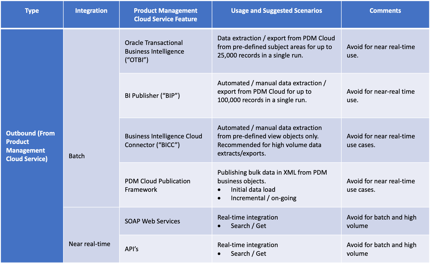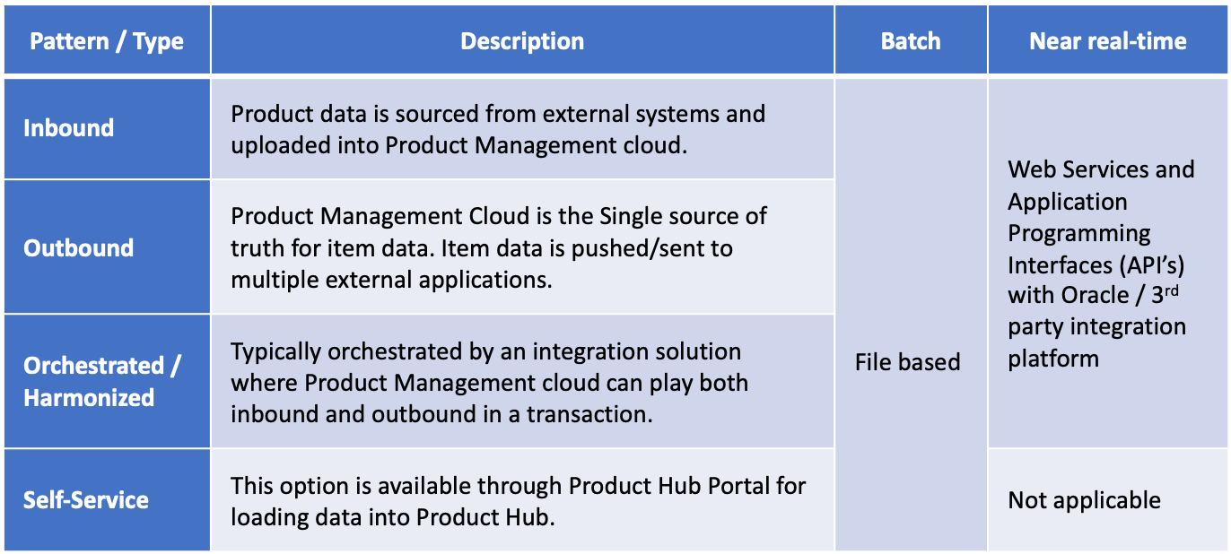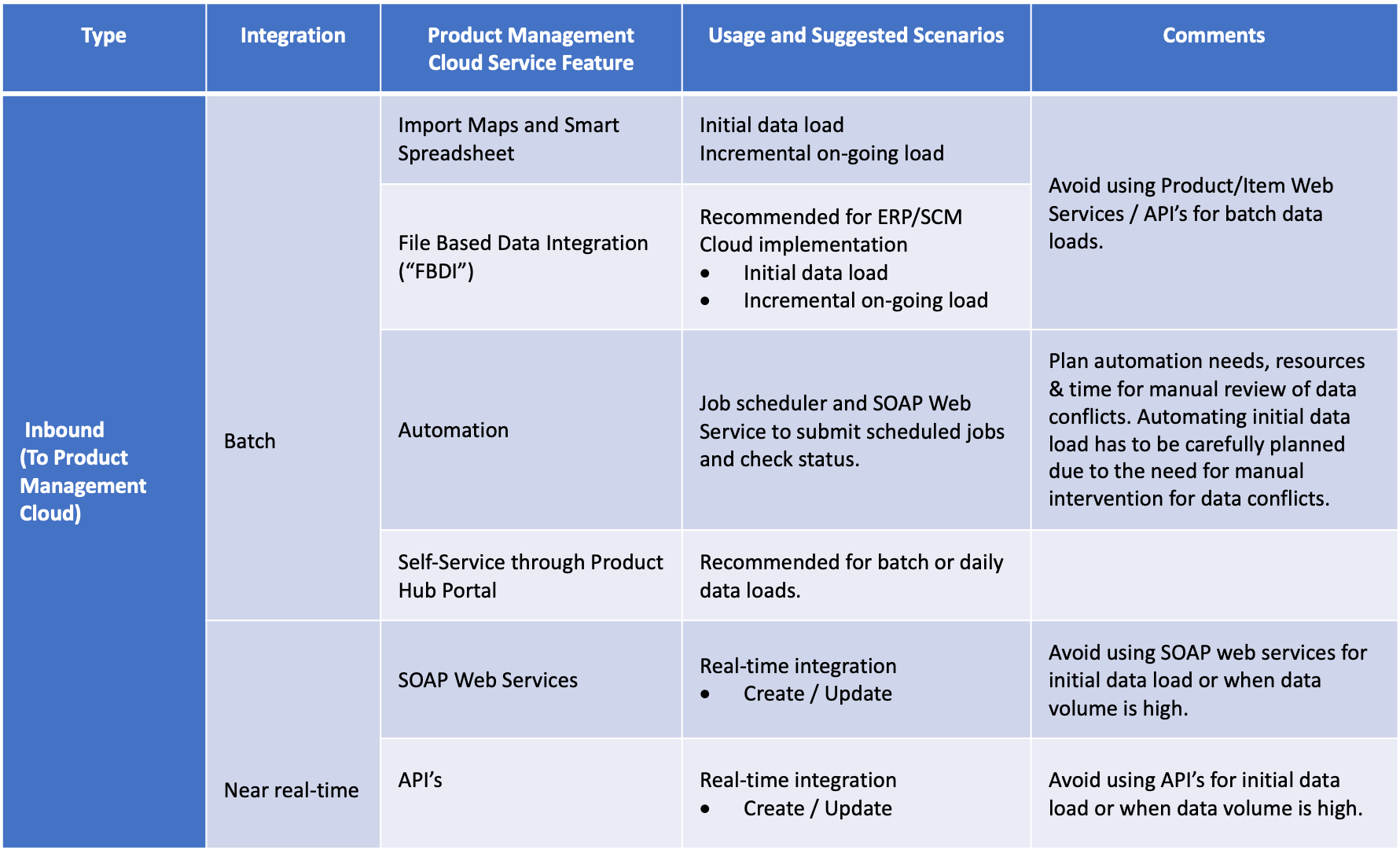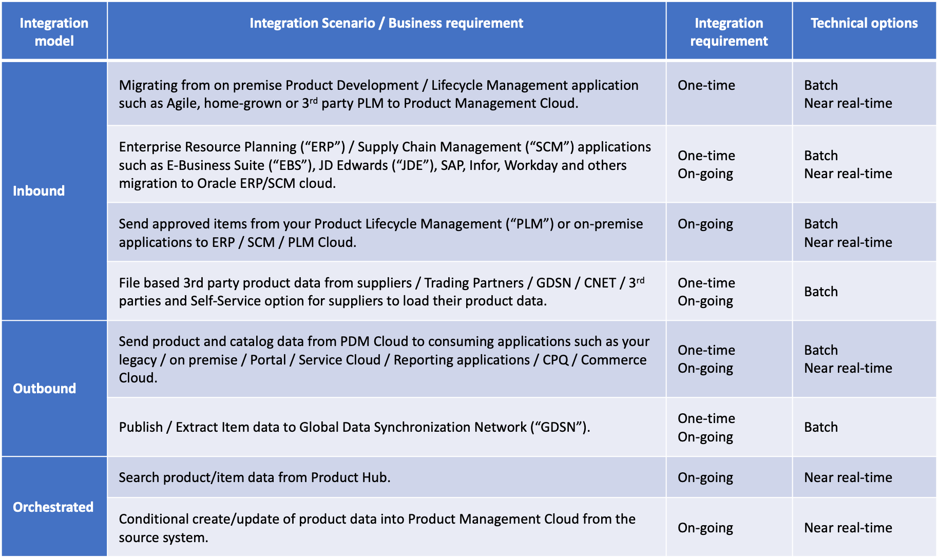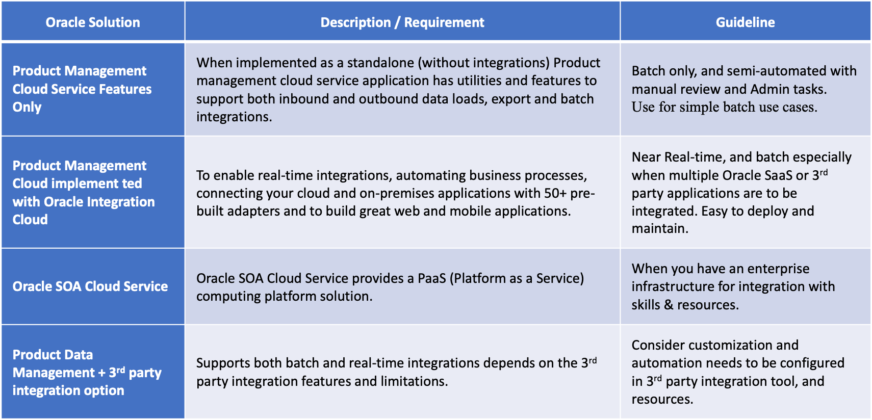 While deploying cloud applications, one of the key components is integration. Oracle Product Management Cloud application provide robust features to support both inbound and outbound integrations. There are several integration technology and solution options available today for you to choose from based on your business and technical requirements. The table below can be used as the guideline for deciding the options for your integration needs during the Product Management Cloud implementation.