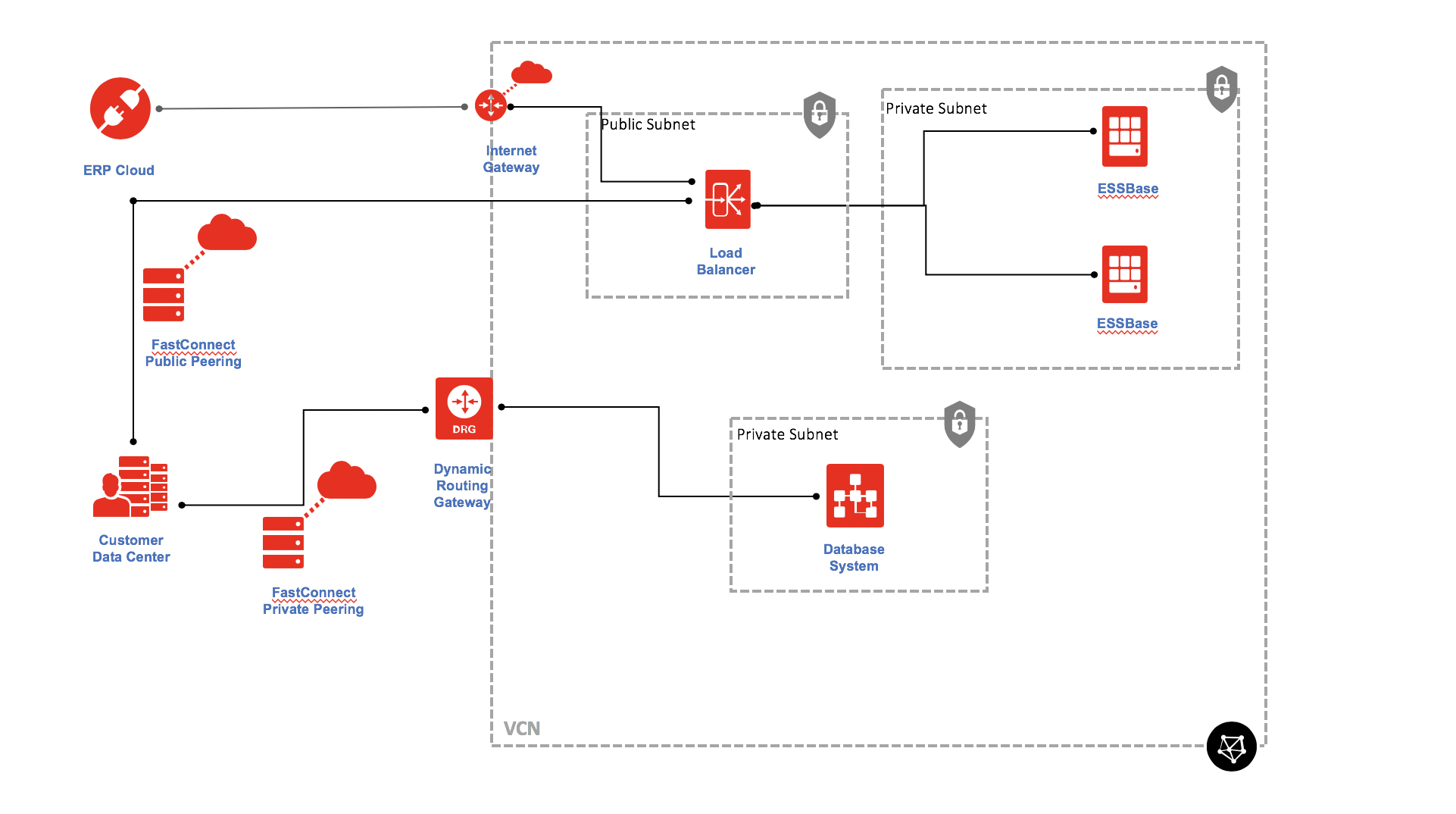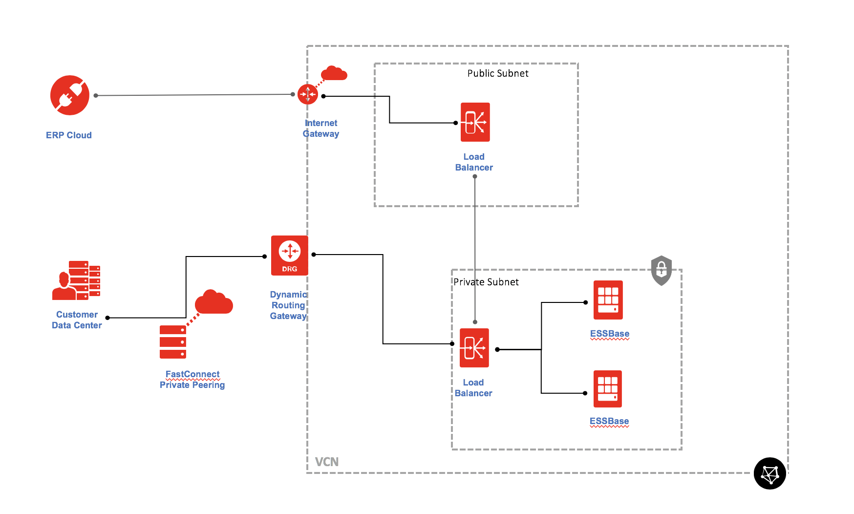 So, what to do now? Any solution will generally require three steps (see next section though) – i) the ERP requests will enter the VCN via the Internet Gateway, ii) the requests need to be handled in a public subnet ( a consequence of step i above), and iii) forwarded to the private load balancer for onward journey to the ESSbase servers. How to achieve this? Use a public load balancer!