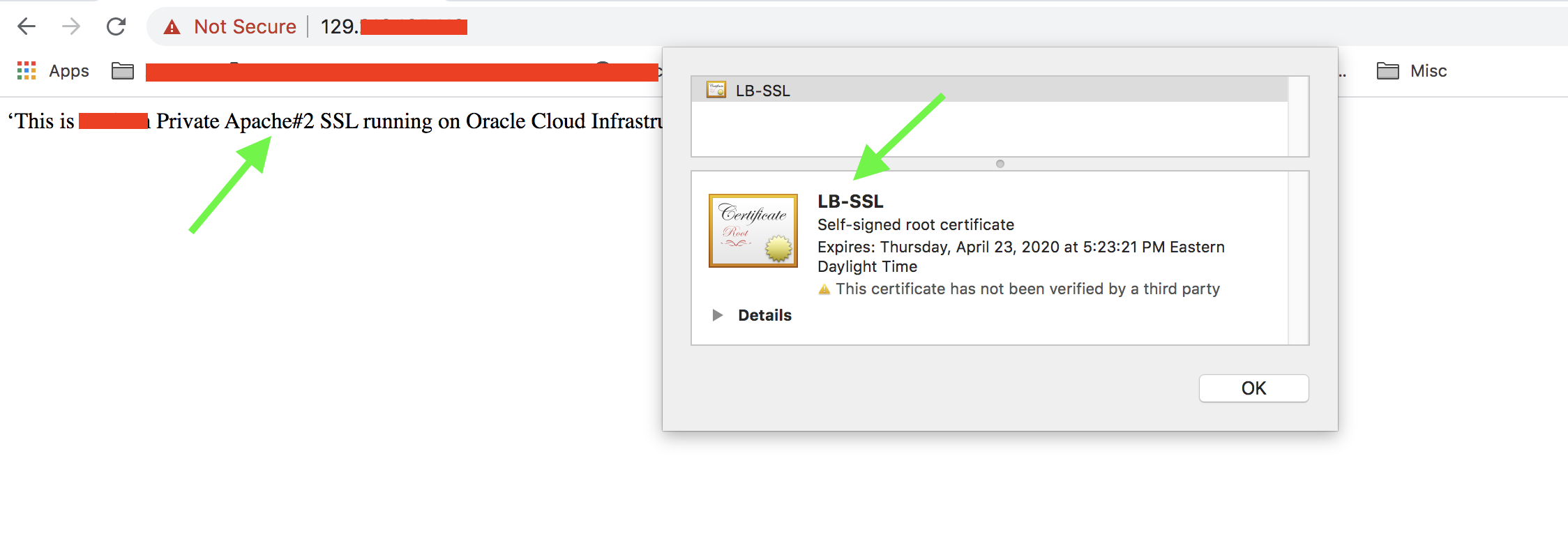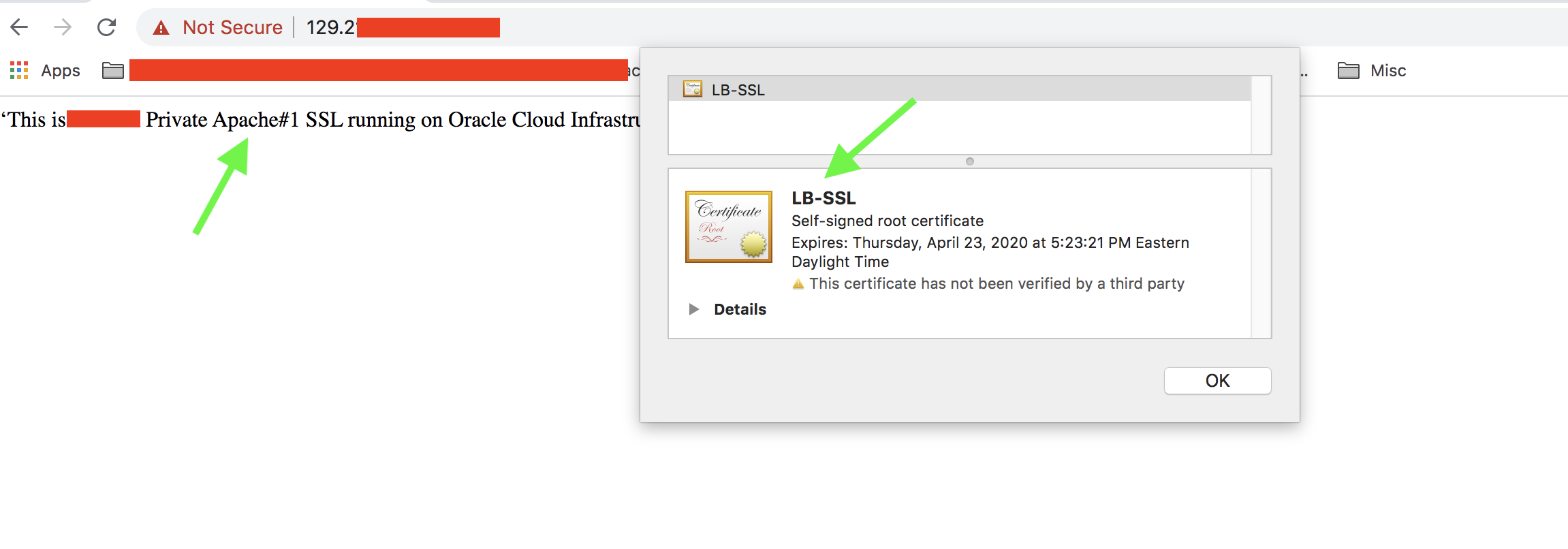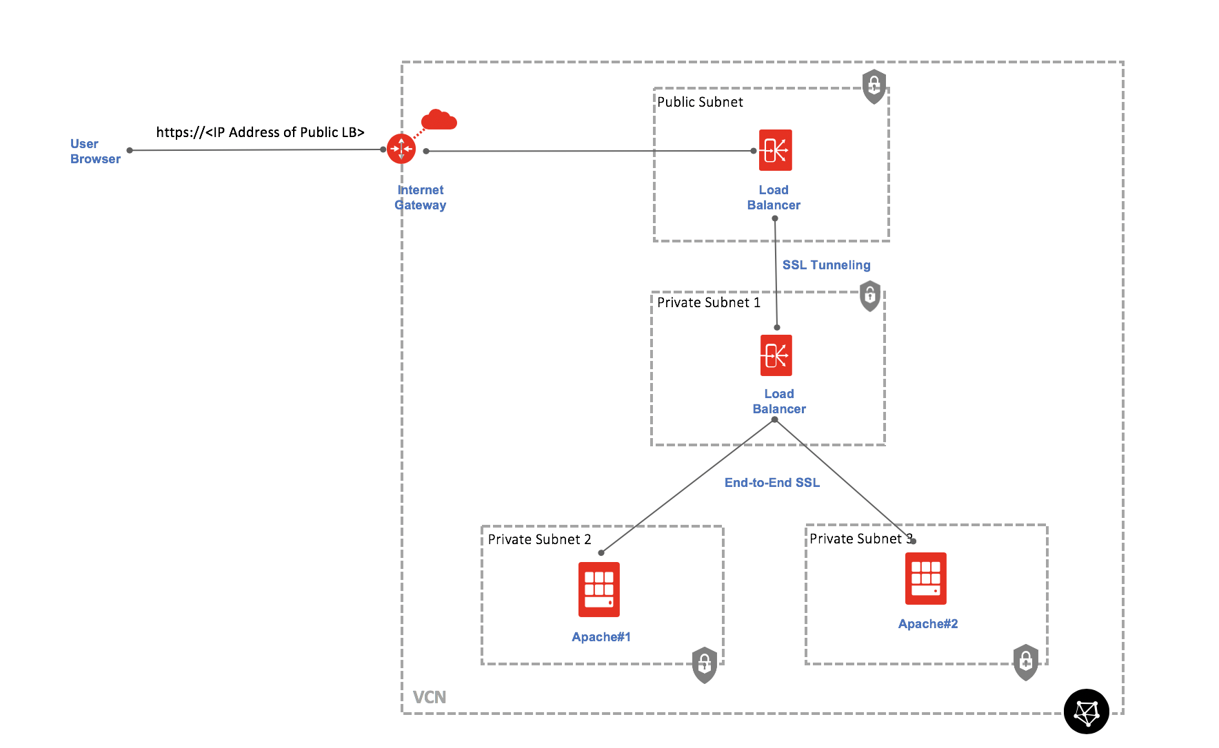 In the above setup, the two Apache HTTP servers are configured on different private subnets. SSL is configured on both of them. The index page on each Apache has the following: “This is Private Apache#n SSL running on Oracle Cloud Infrastructure”. These two Apache servers comprise the backend set of the private load balancer.