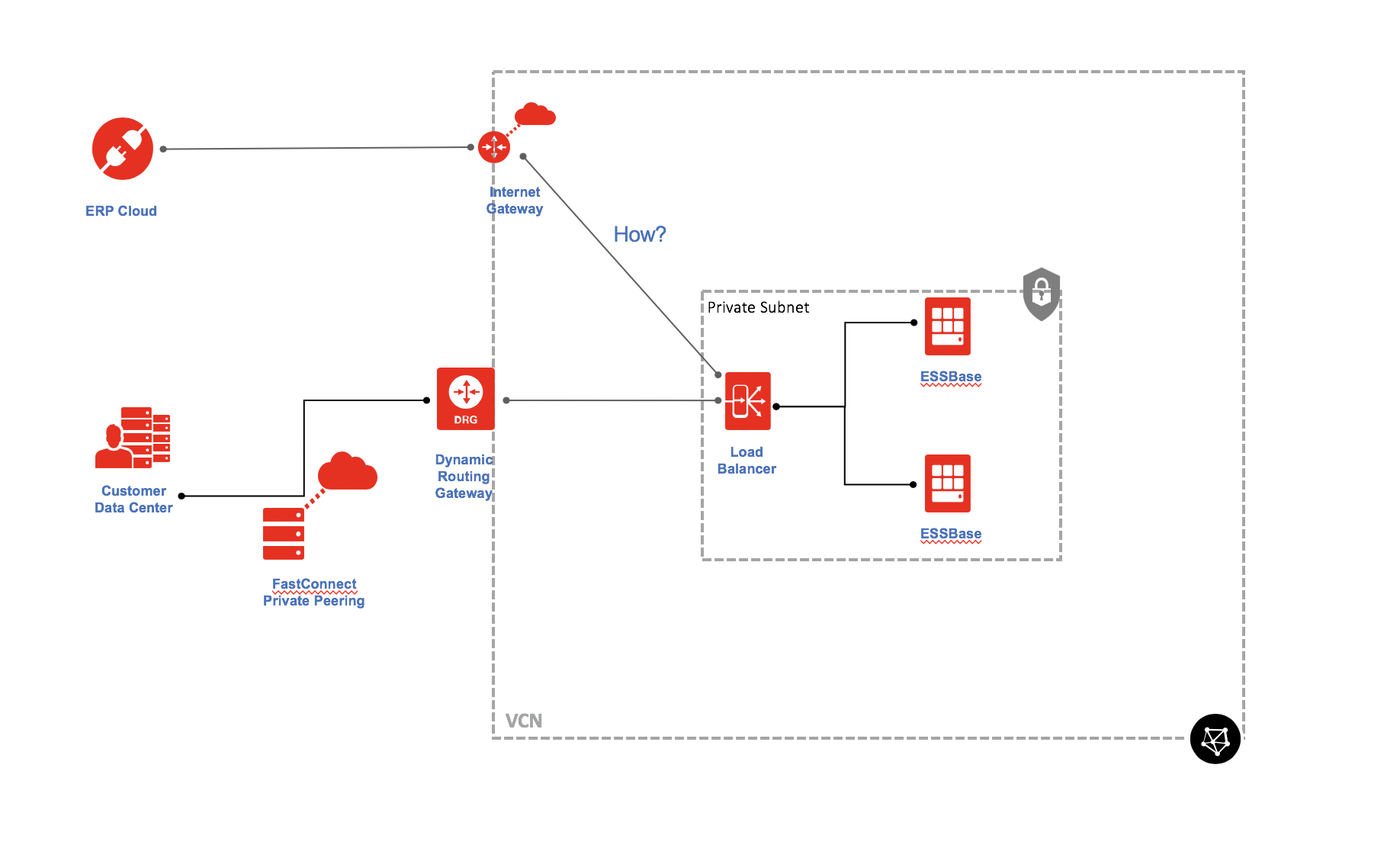 Although the above scenario depicts the primary use case of hybrid cloud, there can be some wrinkles along the way. There may be requirements to access these private OCI computes from the internet. For example, customers can deploy Oracle ESSbase servers on private subnets. They may also use Oracle ERP Cloud and there can be a requirement where ERP Cloud needs to access ESSbase. Since ERP Cloud is outside OCI, ERP requests would be required to enter the VCN through an Internet Gateway. However, the route to the ESSbase servers traverses through the private load balancer which is inaccessible from outside OCI. The following figure depicts this challenge.