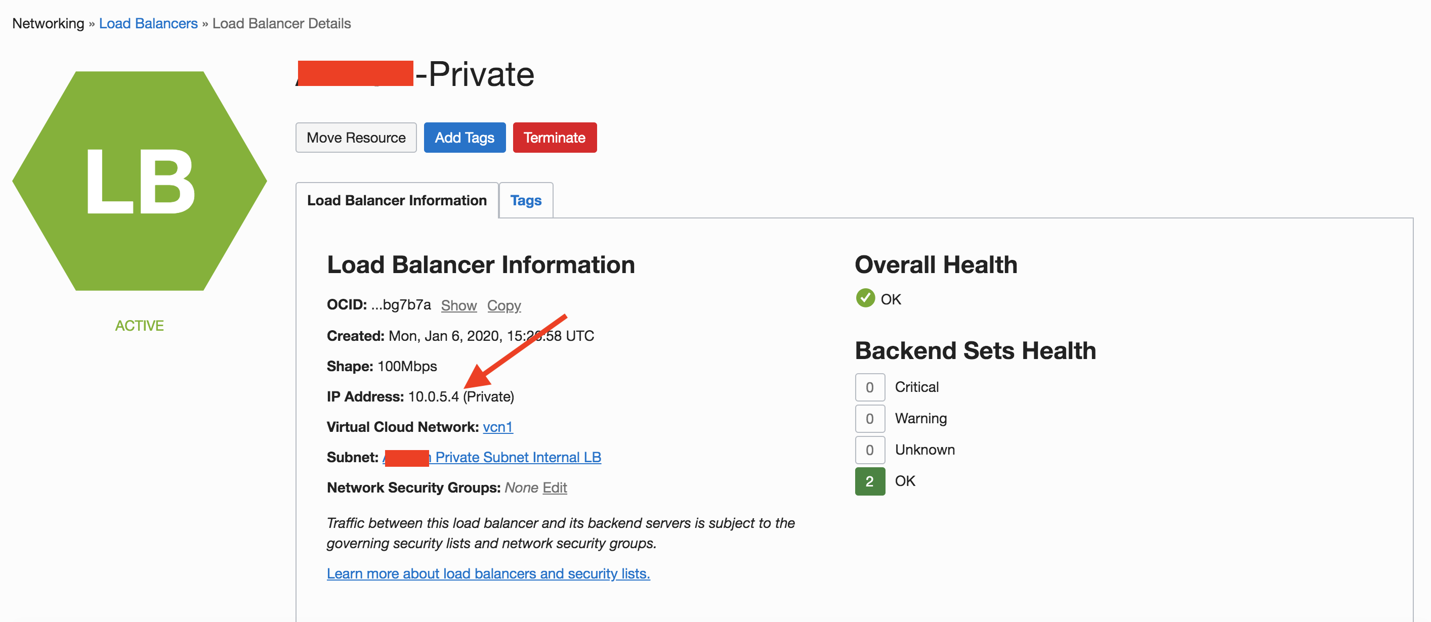 In the above figure, 10.0.5.4 is the IP address of the private load balancer. Port is 443 since that is the default SSL port. You can get the IP address of the private load balancer from the load balancer’s main UI as shown below:
