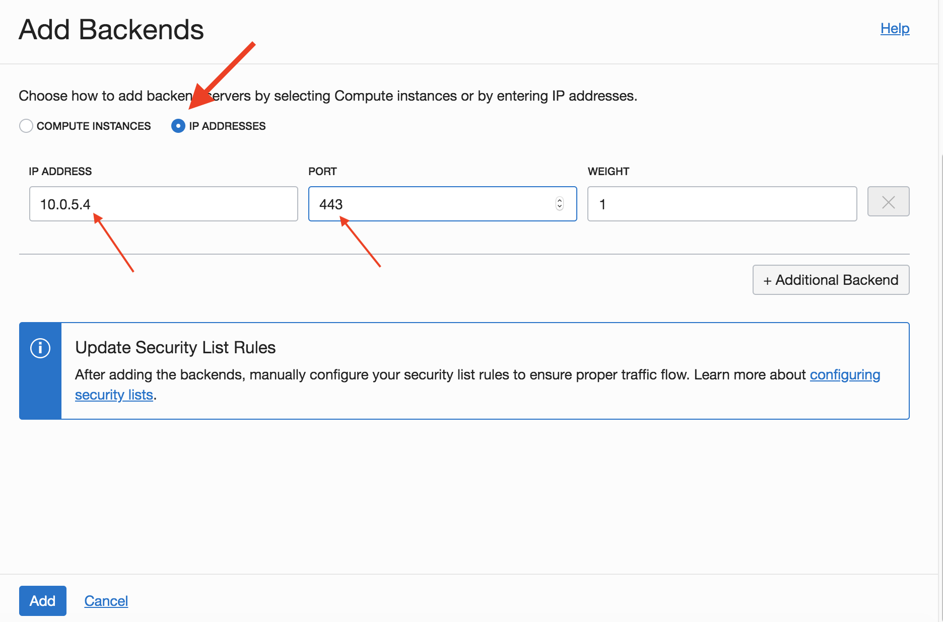 The SSL configuration between the public and the private load balancer is “SSL Tunneling”. Again, it could have been any other type of SSL configuration such as End To End SSL, however, the intent here is to demonstrate how to transport user traffic from the internet to the private load balancer. That is, how to tunnel this traffic! Although setting up SSL Tunneling between the public and the private load balancer is trivial, and Load Balancing SSL Traffic in OCI gives a detailed description about the configuration, I would like to highlight a key point pertaining to our setup here: the backend set of the public load balancer has just 1 backend, namely the private load balancer. To configure this, go to the “Add Backends” UI of the public load balancer, select “IP addresses” and fill in the IP address of the private load balancer as shown below.