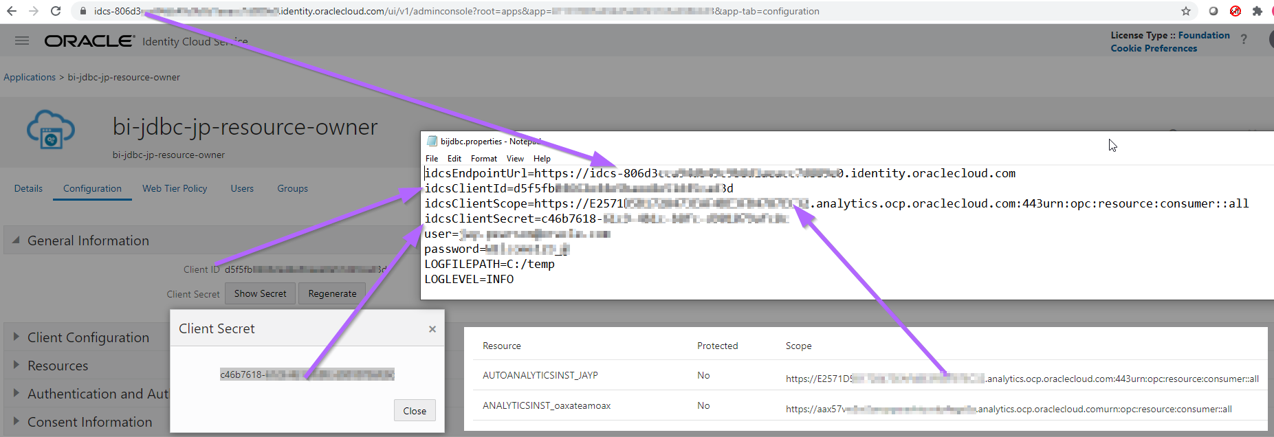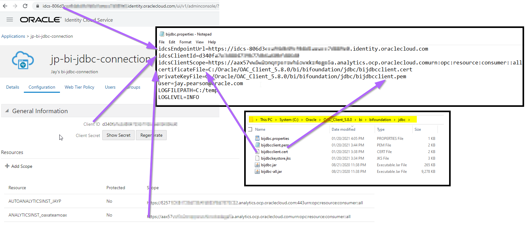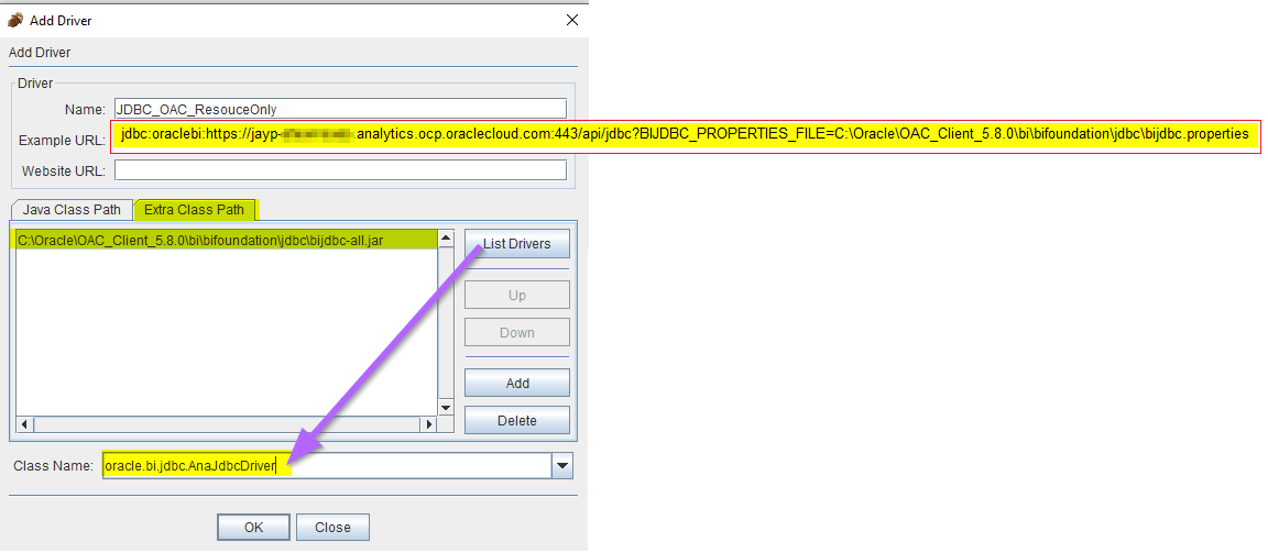 Example URL: jdbc:oraclebi:https://jayp-xxx.analytics.ocp.oraclecloud.com:443/api/jdbc?BIJDBC_PROPERTIES_FILE=C:\Oracle\OAC_Client_5.8.0\bi\bifoundation\jdbc\bijdbc.properties