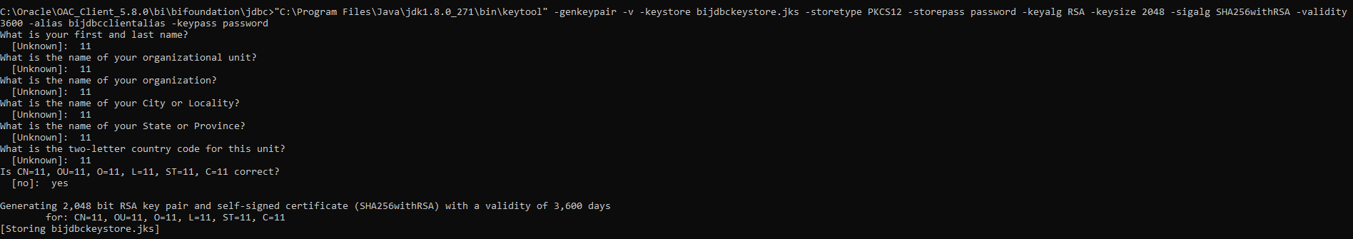 “C:\Program Files\Java\jdk1.8.0_271\bin\keytool” -genkeypair -v -keystore bijdbckeystore.jks -storetype PKCS12 -storepass password -keyalg RSA -keysize 2048 -sigalg SHA256withRSA -validity 3600 -alias bijdbcclientalias -keypass password