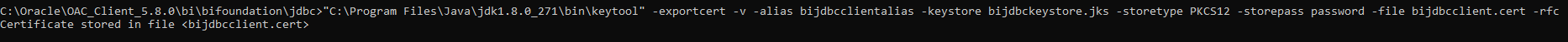 “C:\Program Files\Java\jdk1.8.0_271\bin\keytool” -exportcert -v -alias bijdbcclientalias -keystore bijdbckeystore.jks -storetype PKCS12 -storepass password -file bijdbcclient.cert -rfc