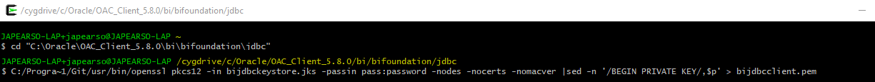C:/Progra~1/Git/usr/bin/openssl pkcs12 -in bijdbckeystore.jks -passin pass:password -nodes -nocerts -nomacver |sed -n ‘/BEGIN PRIVATE KEY/,$p’ > bijdbcclient.pem