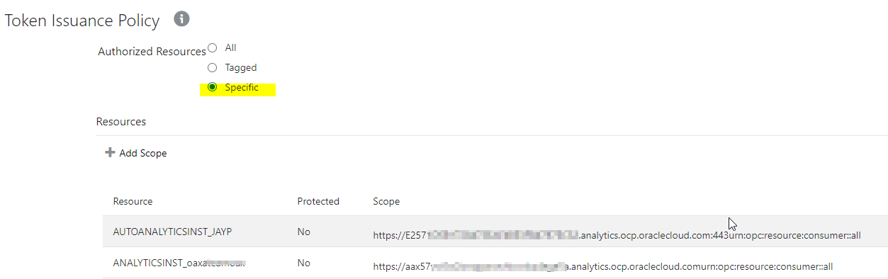 Select “Authorized Resources” = Specific -> click + Add Scope -> add OAC/FAW Resources.