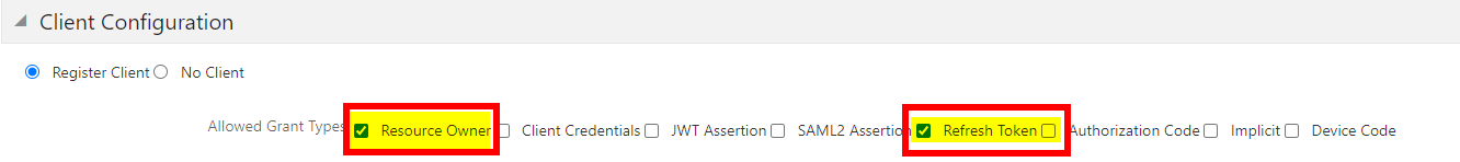 Select “Configure this application as a client now”, “Allow Grant Types” = “Resource Owner” and “Refresh Token”.