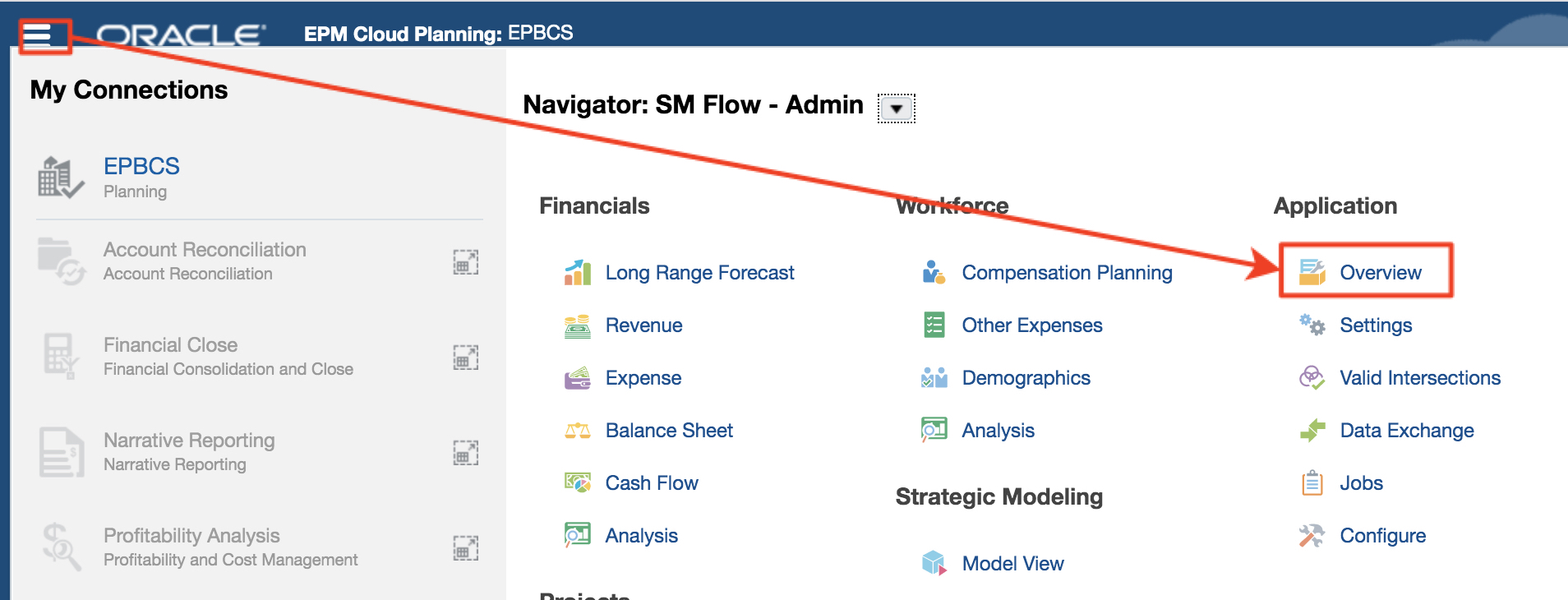 b) Once logged in EPM Cloud, click on the upper left hamburger and navigate to Application > Overview menu