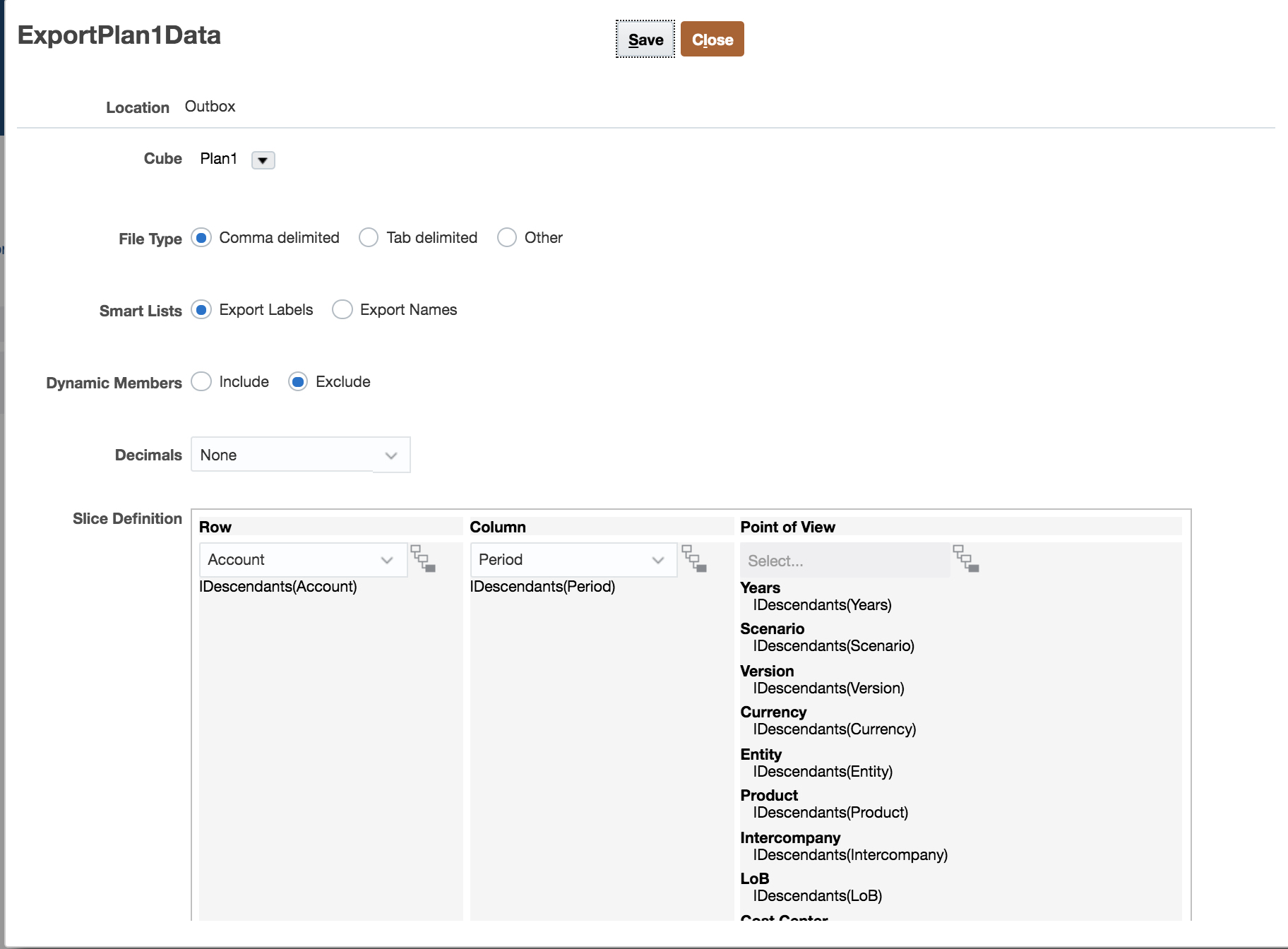e) Enter a Name for the Export (here ExportPlan1Data), select outbox as the location, comma separated file type, export labels, exclude dynamic members, for rows and columns make sure to choose dense dimensions, and select the dimensions members to constitute the point of view.