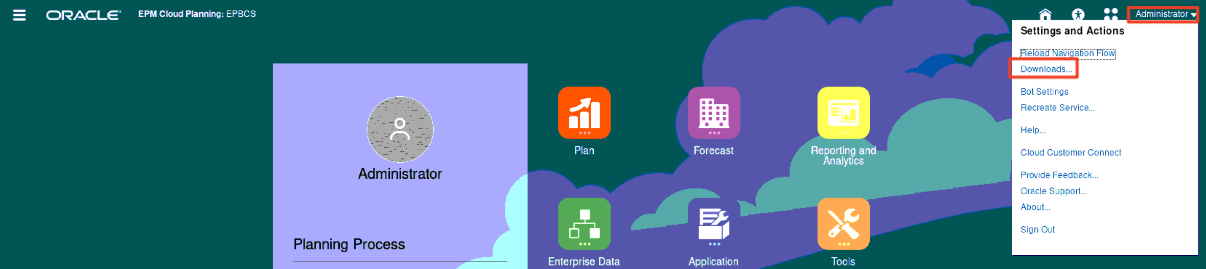 a) In EPM Cloud, click on your user name on the top right corner (here Administrator) and click download