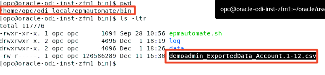 Then the file will need to be download from EPM Cloud. In the next steps of this section, the assumption is that the CSV file is present under /home/opc/odi_local/epmautomate/bin folder, as per the figure below: